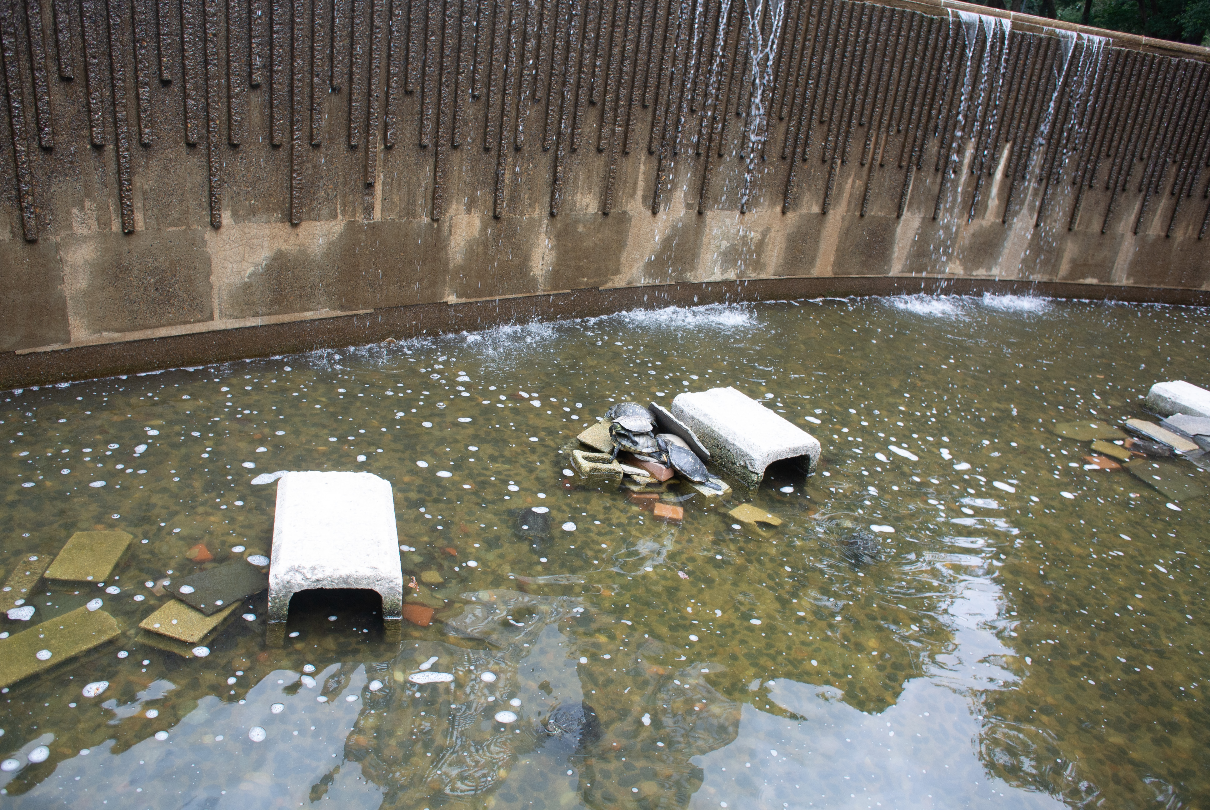 The area I was sitting was behind a water feature and had run off falling into a small pool filled with rocks and a few turtles. The view was wonderful and the air was cool and slightly windy so I was very relaxed and generally at peace.